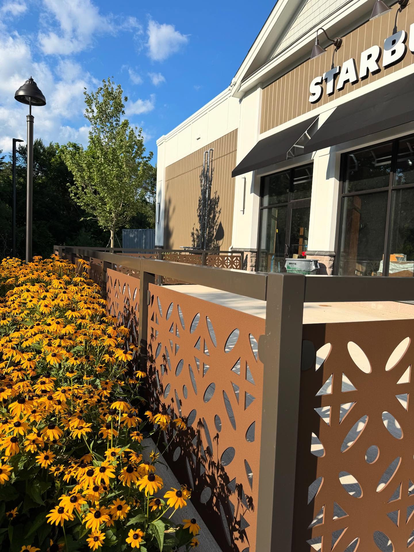 Our team completed a stunning architectural patio installation at the new Starbucks in Concord using premium metal panels from Parasoleil. The sophisticated design creates an inviting oasis that perfectly complements the café experience while enhancing the entire outdoor space. Contact us for a free estimate.