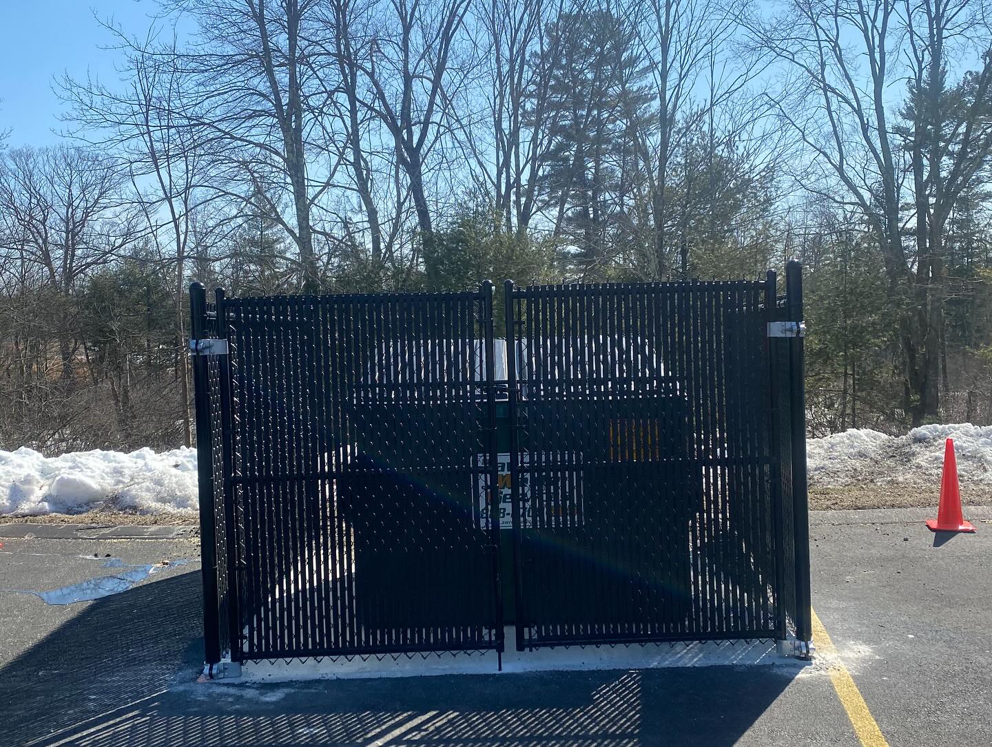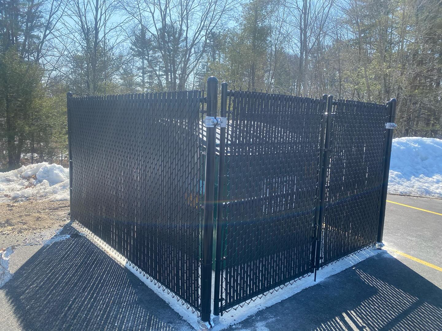 A simple yet effective 6-foot black chain link dumpster enclosure for R&R Landscaping on Route 16 in Holliston keeps waste containment secure and tidy. Our commercial solutions handle everyday challenges with durability and style. Ready to organize your waste management? Contact us for a free estimate.