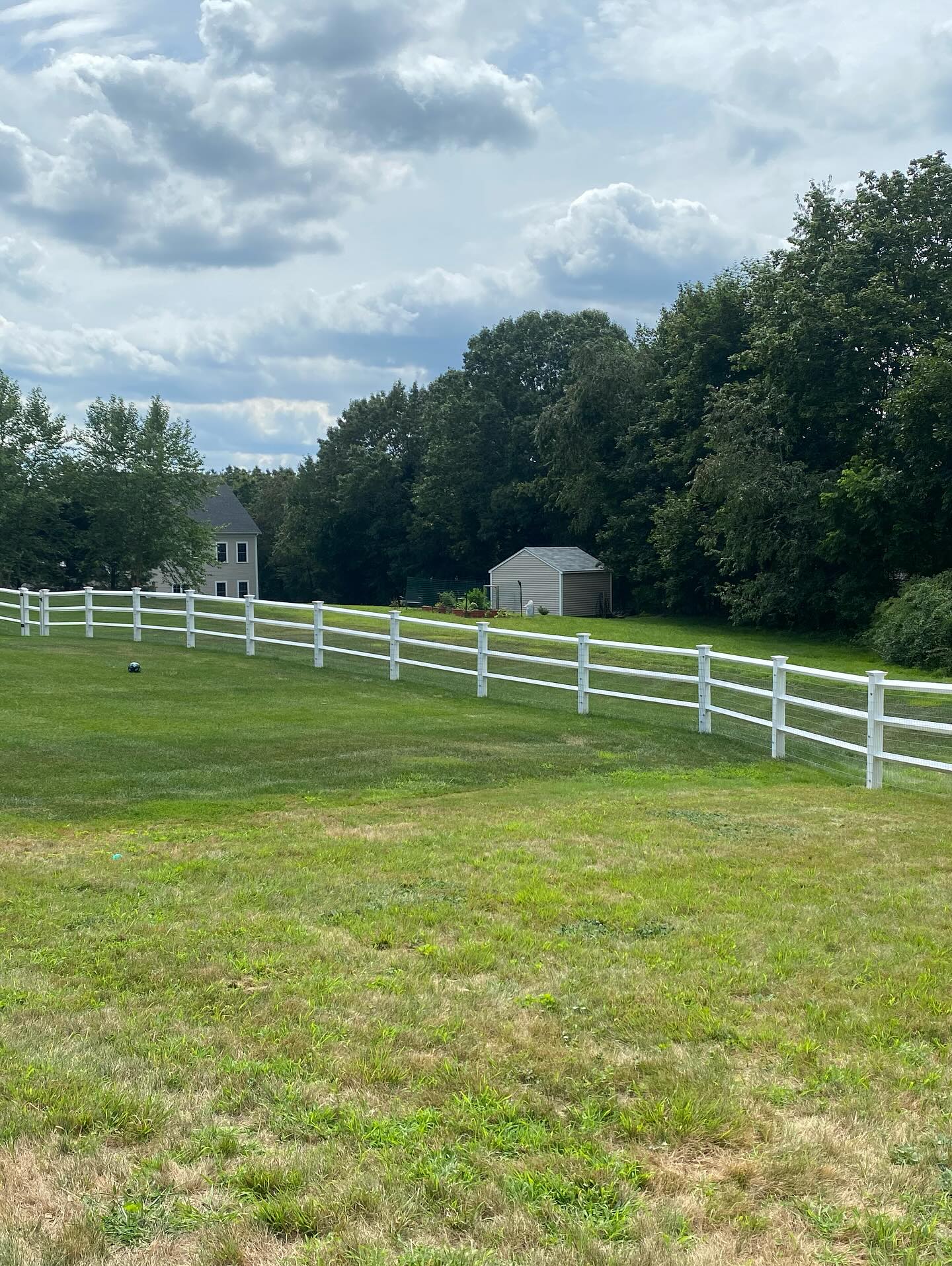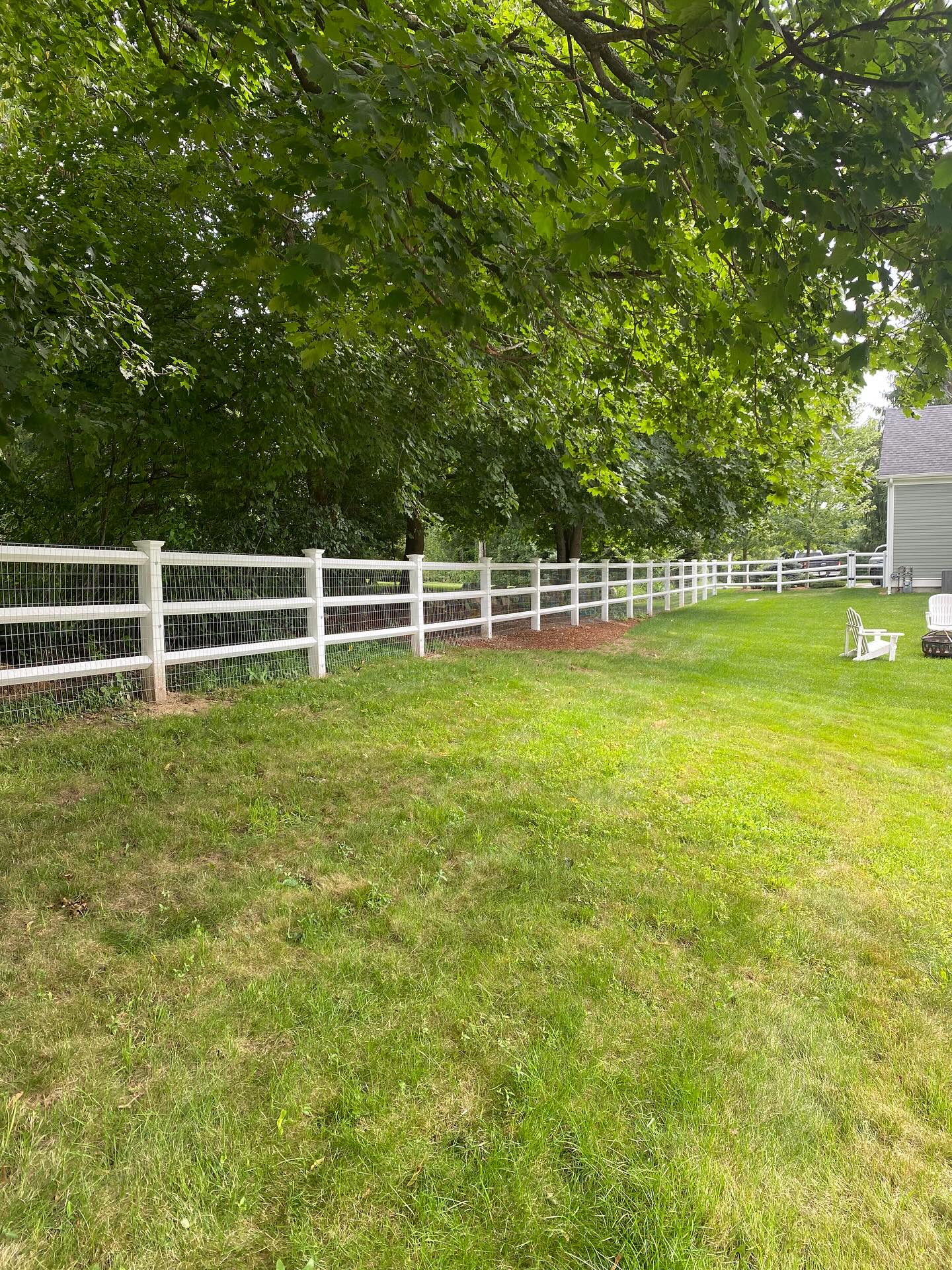 This extensive 400-foot vinyl rail installation in Natick features a striking diamond pattern combined with galvanized welded wire backing for comprehensive security. The clean vinyl construction maintains its pristine appearance while providing the durability and strength needed for long-term yard protection. Contact us for a free estimate.