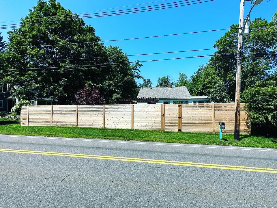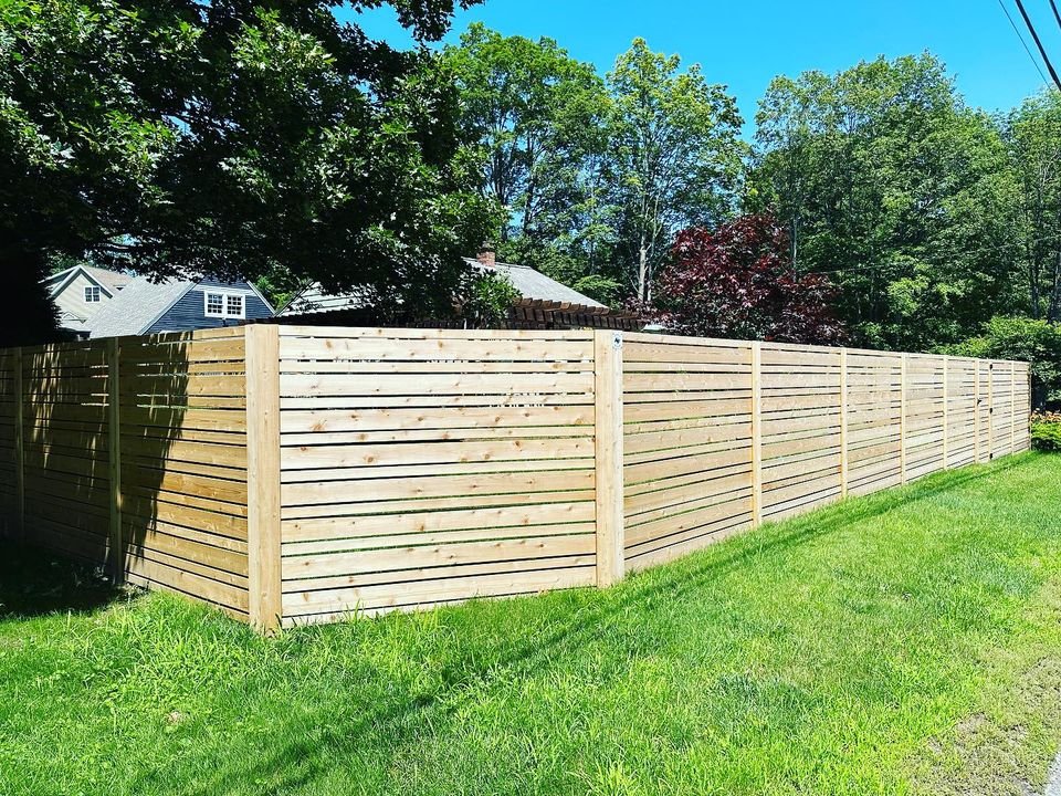 Melo’s crew crafted what’s arguably Southborough’s most stunning fence! A horizontal spaced cedar with alternating board widths. This masterpiece is a grand display of our imaginative design capabilities, now part of our portfolio. Considering a standout cedar fence that commands attention? We’re here to bring that vision to life, starting with a free estimate.