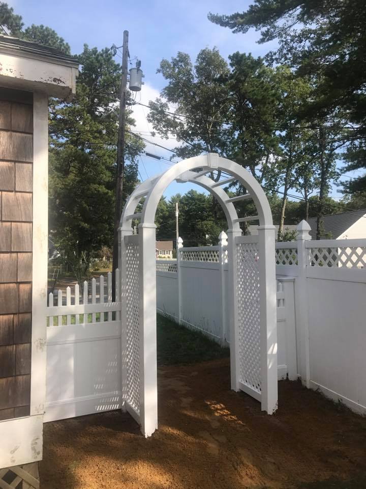 A custom arbor and fence sections now grace the entrance to a backyard sanctuary by the water, crafted in just a day’s work. Considering an elegant new entrance to your haven? Our portfolio displays our craftsmanship. Reach out for your dream fence consultation.