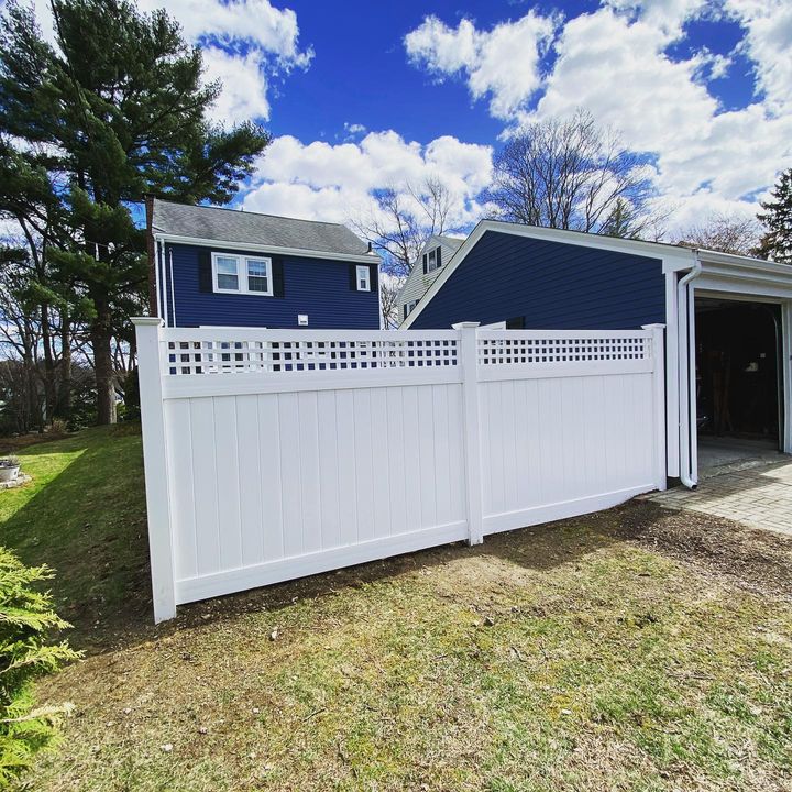A new installation in West Roxbury enhances privacy and decor with a 6-foot vinyl fence including decorative rail and lattice work. This design is a testament to our fusion of function and flair. Explore the possibilities for your property by visiting our portfolio and contacting us today.